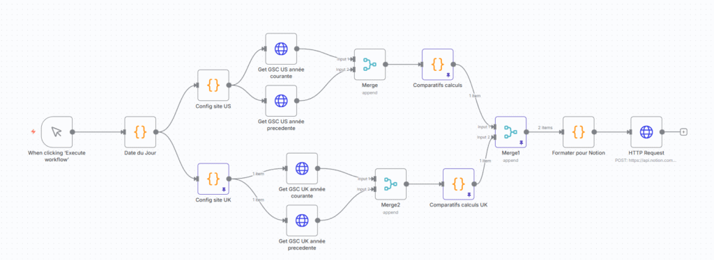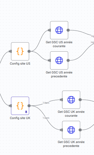 - Parameterize Everything. Notice how my workflow has separate « Config » nodes for the US and UK sites? This is key. By defining the siteUrl and siteName at the beginning, you can easily add more sites just by copying that block. Don’t hardcode URLs into your API calls.